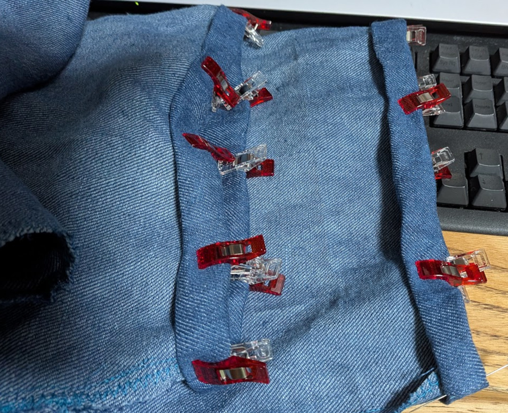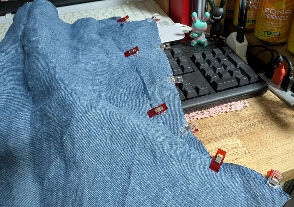 それから2本を合わせて、股部分を縫うために「仮止めクリップ」(まち針より楽なので、以前から使っています)で留めて、縫います。(ゴムを入れる部分は残しておく)