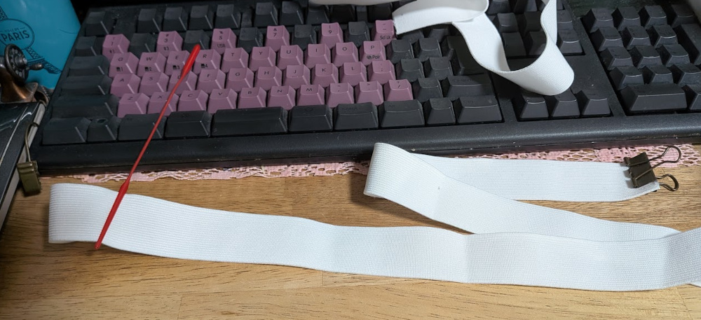 ゴムを通して、最後にミシンでゴムの 端通しを縫って留めました。ゴム通しは、片手では難しくて手伝ってもらいました^^;