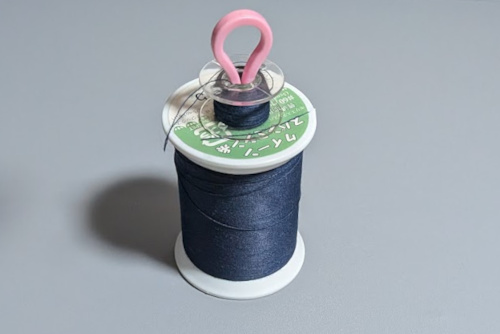 これも、片手とは関係ありませんが、上糸と下糸を仕舞うときにバラバラにしていると、次に使うときに分からなくなって困るので、一緒に仕舞えるダイソーのボビンストッカーを使ってます。便利です。