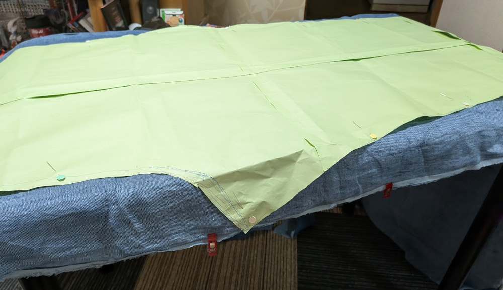 ダブル幅(1600cm)で4mあったので、型紙を1本分のズボンの長さ分だったら3本とれると思ったんですが、少し幅が足りなかったので、自分のお尻幅を測ってギリギリいけるように型紙を修正しました。